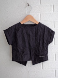 ショート丈、背中の開いたデザイン、切りっぱなしのネックラインや裾が特徴。