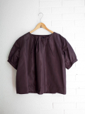 商品INFO ほんのり紫がかった深いブラウン、ハリのあるポリエステルタフタ生地のオーバーブラウス。