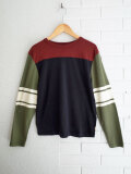 程よいクルーネックにリラックスしたカッティング、袖のクリームのラインと対照的な肩ヨークの赤茶が効いた
